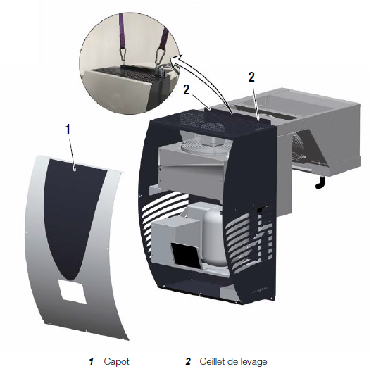 - Accrochez un dispositif de levage adapté dans les œillets de levage (2).